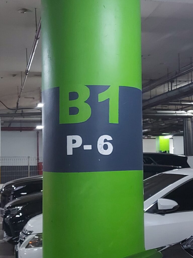 Foto tiang dengan nomer dan warna tertentu menunjukkan lokasi parkir. Foto seperti ini penting untuk menjadi pengingat lokasi di mana kita memarkir mobil. Apalagi jika tempat parkirnya luas. Jika tanpa petunjuk parkir maka kita akan kesulitan menemukan lokasi parkir mobil.