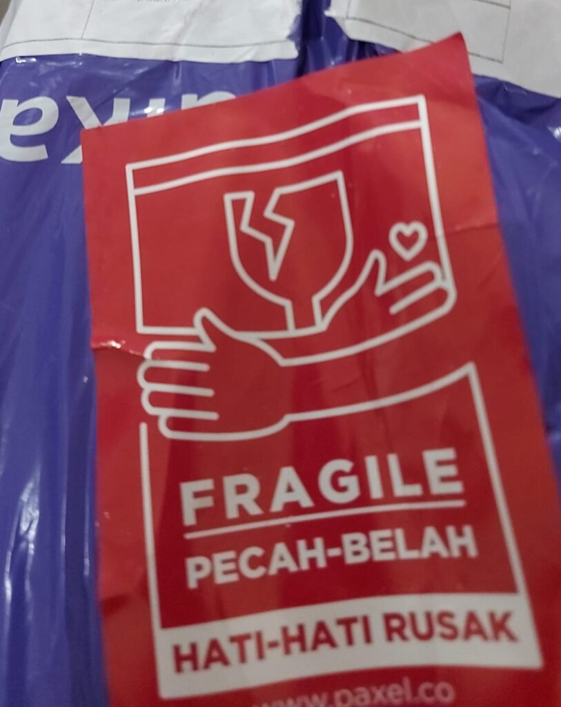 Stiker merah memberi peringatan bagi setiap orang untuk berhati-hati karena benda yang ada di dalamnya merupakan benda yang rapuh. Orang-orang yang ada di sekitarnya hendaklah memegang atau menaruhnya dengan hati-hati.