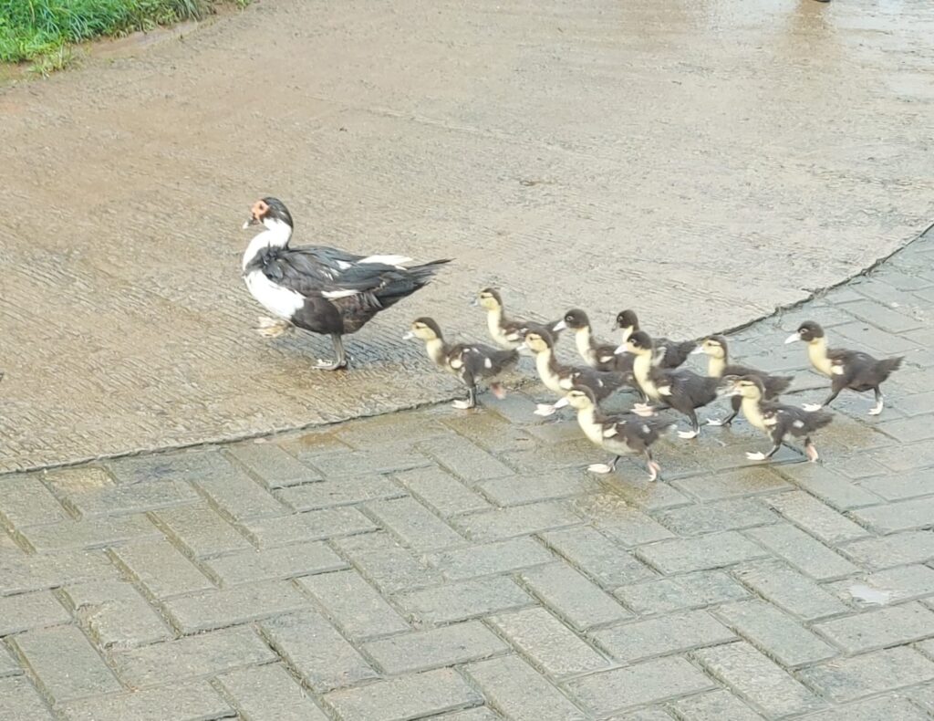 Seekor induk enthok bersama anak-anaknya melintasi jalan. Sambil terus bersuara, induk enthok menuntun anak-anaknya menuju ke tempat yang lebih aman. Membimbing mereka ke tempat yang tak menjadi lalu lalangnya orang atau kendaraan melintas.